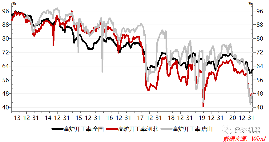 3)環保風暴。金山銀山不如綠水青山。建設綠色中國,是地方政府考核的硬杠杠和“高壓線”。一旦環保排名倒數,輕則主要負責人誡勉談話,重則下臺負責。相反,新時代淡化了對經濟增速的要求,不追求高增長成為一種“共識”。在環保硬約束、增長有彈性的情況下,各級地方政府將“環保”置于“增長”之上,環保限產始終處于高壓狀態。比如,3月19日,唐山發布鋼企限產最新措施,全市全流程鋼鐵企業3月20日至12月31日減排比例達到30%-50%。目前河北和唐山高爐開工率僅有48%,遠低于全國62%的水平(圖6)。
