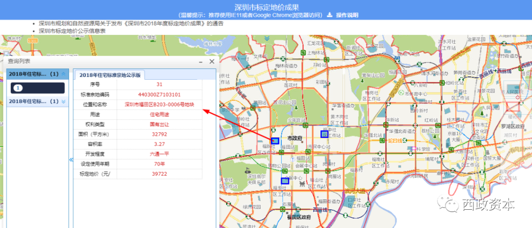 2. 標準宗地:在按用途劃分的標定區域內,有且只有一塊代表該標定區域內該用途的標準地塊,即標準宗地。以深圳市政府所處住宅用途標定區域為例(藍色方塊即是標準宗地)。