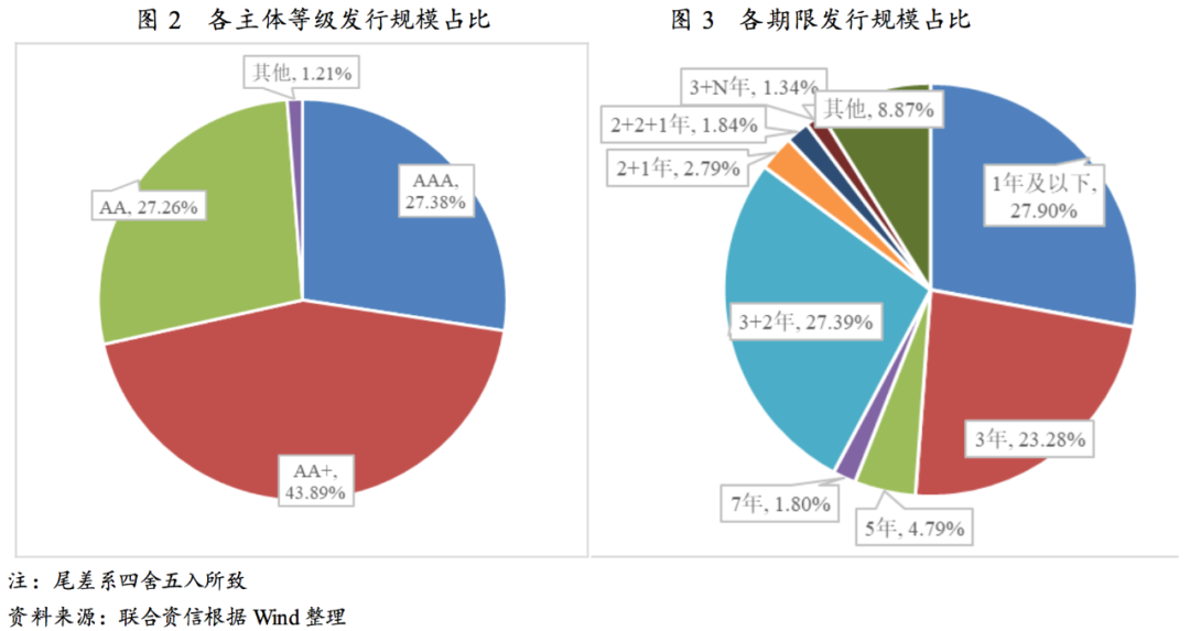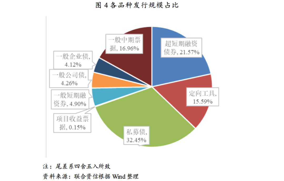 公、私募發行規模占比保持均衡態勢,公募占比略有上升;發行期限仍以中短期為主,3年期發行規模占比進一步上升;發行品種以私募公司債和超短期融資券為主,一般中期票據和定向工具發行規模快速增長。