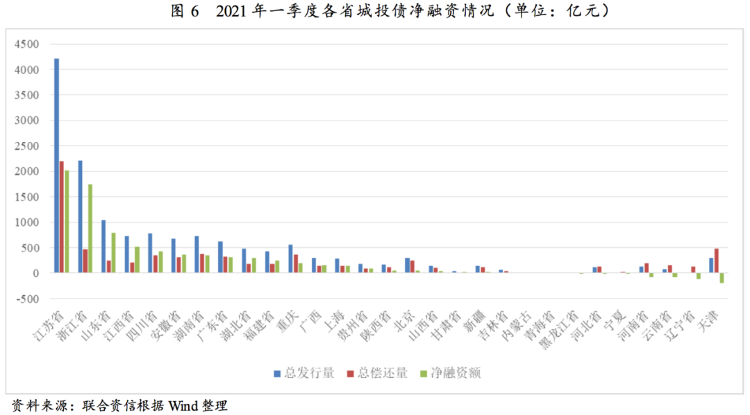2021年一季度,再融資需求擴大及市場情緒修復,城投債發行規模大幅增長,但凈融資仍呈區域分化態勢;貨幣政策邊際收緊導致發行利率同比上升明顯。二季度,市場資金面邊際收緊態勢仍將延續,城投債到期規模仍較大,但考慮一季度城投債凈融資及二季度地方政府債發行加速等因素,二季度城投債發行增速將放緩。貨幣政策邊際收緊及地方政府隱性債務高壓監管的態勢下,城投債信用風險持續分化。對于政府債務負擔重、經濟下行壓力大、非標信用風險事件頻發區域,尤其是信用資質較弱、非標融資占比較高城投企業的信用風險仍需持續關注。