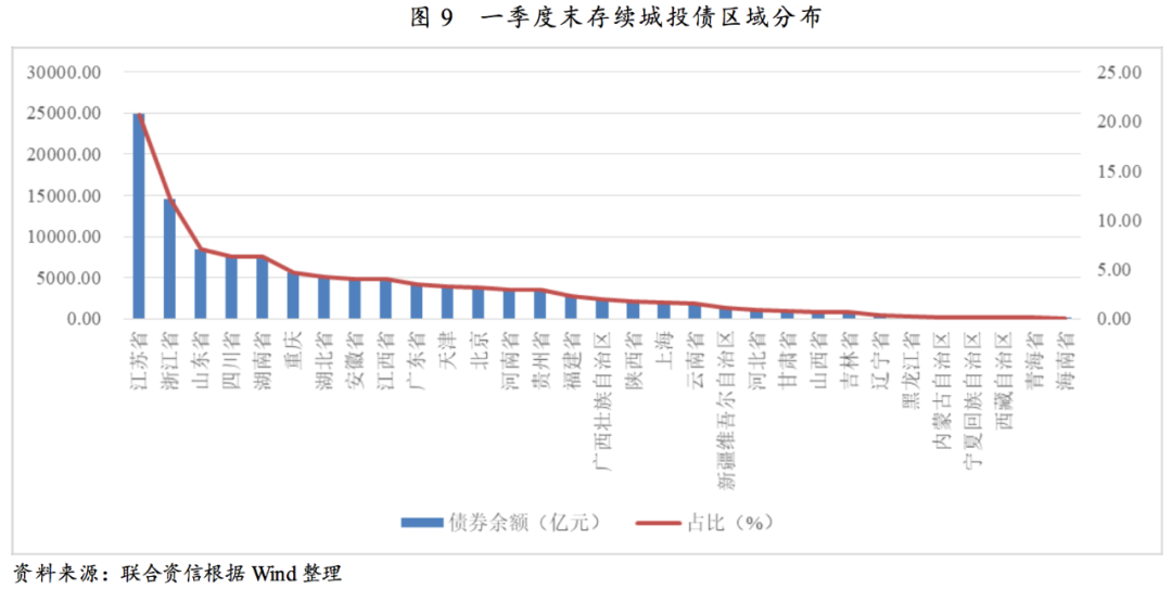 截至一季度末,有存續債券的城投企業共2812家,存續城投債券共15930支,存續債券余額120494.31億元。從地區分布看,江蘇省城投債券余額為24893.85億元,占比為20.66%,居于首位;浙江省、山東省、四川省和湖南省分列二至五名,占比分別為12.12%、7.01%、6.34%和6.30%。
