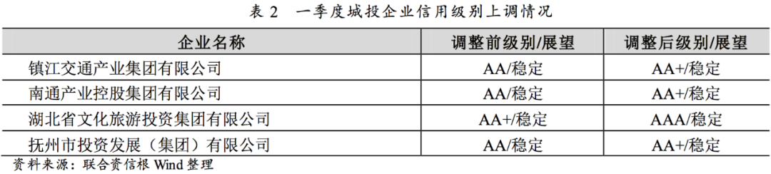 一季度,主體級別調升的城投企業共4家,其中,主體級別自AA上調至AA+的城投企業3家,AA+上調至AAA的城投企業1家;主體信用級別調升的城投企業位于江蘇省、湖北省和江西省。