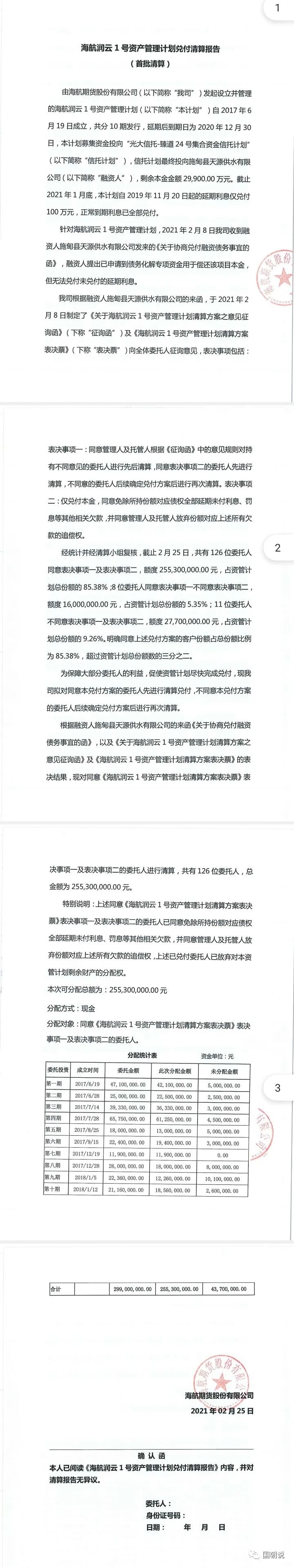 2021年2月25日,海航期貨發(fā)布了《海航潤云1號資產管理計劃兌付清算報告(首次清算)》。