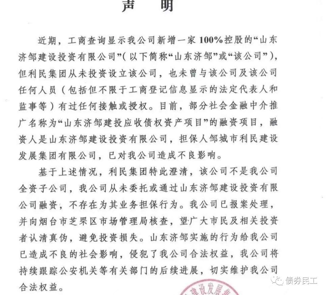 2021年12月10日,鄒城市利民建設(shè)發(fā)展集團有限公司(以下簡稱“鄒城建發(fā)”)發(fā)布聲明,工商查詢顯示新增一家100%控股的“山東濟鄒建設(shè)投資有限公司”,該公司不是公司的全資子公司。鄒城建發(fā)從未委托或通過山東濟鄒建設(shè)投資有限公司融資,不存在為其業(yè)務(wù)擔(dān)保行為。