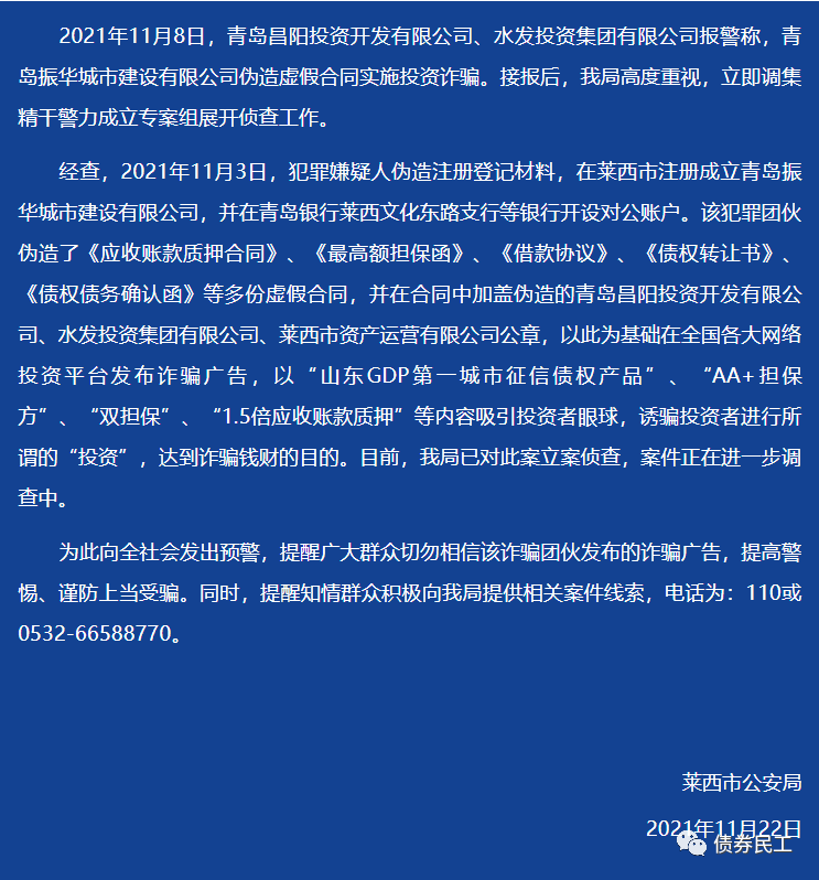 1、2021年11月22日,某李鬼城投公司(青島振華城市建設(shè)有限公司)假冒“水發(fā)投資集團有限公司”和“萊西市資產(chǎn)運營有限公司”的名義在某平臺發(fā)行定融產(chǎn)品“青島萊西振華城建2021應(yīng)收債權(quán)”,直接被公安機關(guān)認(rèn)定為詐騙并發(fā)布預(yù)警。從李鬼城投公司的公司名稱可以看出,相關(guān)不法分子深諳城投公司的特點,明顯是在公司名稱上碰瓷城投公司,同時利用虛假的合同材料,企圖以城投公司的信用發(fā)行產(chǎn)品。