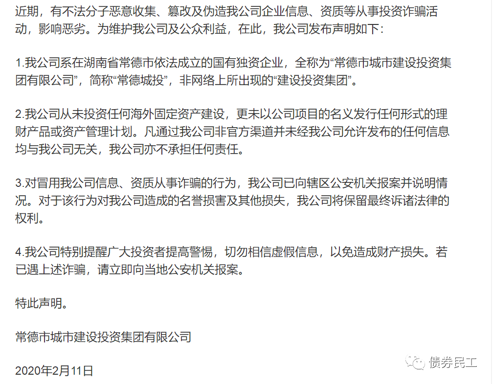 而且在融資之外的其他領(lǐng)域,也有不法分子利用城投公司的名義從事詐騙活動。常德市城市建設(shè)投資集團有限公司于2020年2月20日發(fā)布聲明稱,不法分子利用公司信息和資質(zhì)從事投資詐騙活動。