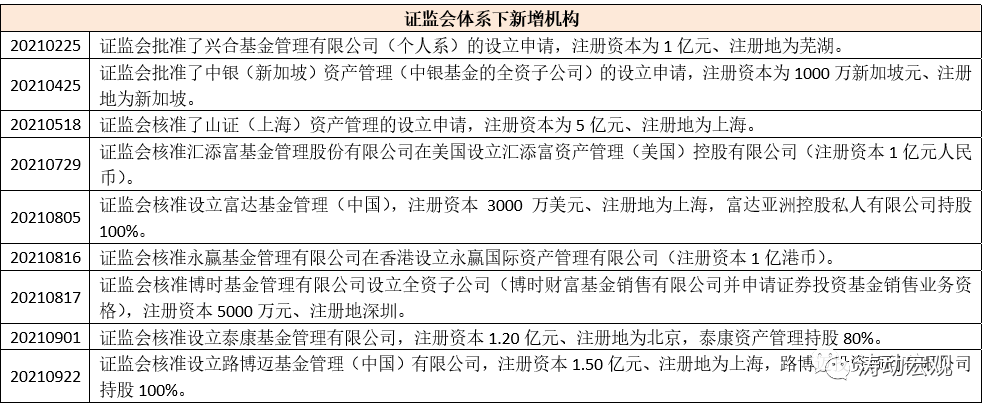 2021年以來,證監會體系下新增9家機構,具體包括4家基金公司、4家資管子公司以及1家基金銷售機構(即博時財富基金銷售)。其中,4家基金公司分別為興合基金(個人系)、富達基金管理(中國)、泰康基金管理(泰康資產管理控股)以及路博邁基金管理(中國),4家資管子公司分別為中銀(新加坡)資產管理、山證(上海)資產管理、匯添富資產管理(美國)以及永贏國際資產管理。值得一提的是,通過設立永贏國際資產管理,意味著作為城商行的寧波銀行,通過永贏基金實現了在香港的戰略布局。