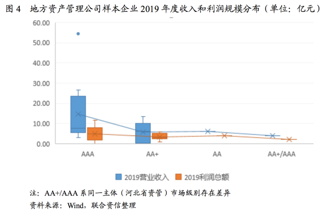 從營業收入和利潤總額來看,2019年,地方資產管理公司中,AAA級別主體的營業收入和利潤總額最大值分別為54.55億元和11.61億元,AA+級別主體中有2家企業的營業收入和利潤總額在AAA序列中能排到靠前位置。AA級唯一主體的營業收入和利潤總額已達AA+收入和利潤水平。值得指出的是,地方資產管理公司對不良資產業務的收入確認方式存在差異,目前普遍有全額法和凈額法2種,導致收入指標差異可能較大,可比性不強,但利潤指標的可比性較好。