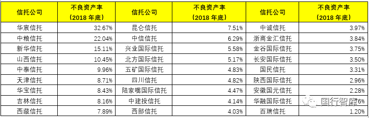 截止2018年底,不良資產(chǎn)率在1%以上的信托公司有27家(有一些信托公司未披露不良數(shù)據(jù))。其中