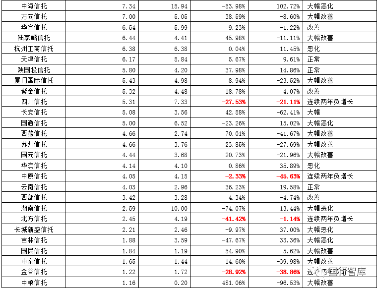 3、平安信托、重慶信托、中融信托、中鐵信托、中誠信托、民生信托、華寶信托、四川信托、中原信托、北方信托、金谷信托、華信信托、華融信托等13家信托公司2018年與2019年連續(xù)兩年的凈利潤均出現(xiàn)下降。