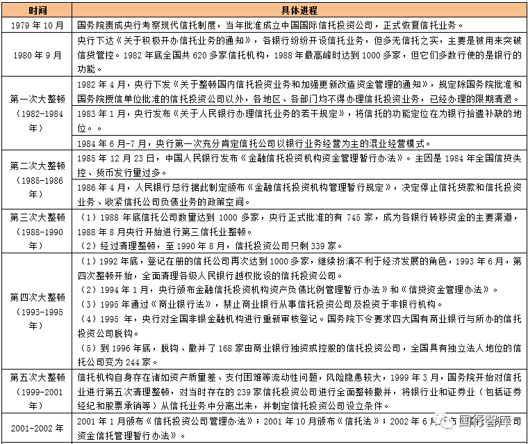 1、1979年與2001年是兩個(gè)關(guān)鍵的時(shí)間點(diǎn),1979年信托業(yè)務(wù)恢復(fù)、2001年我國信托法正式發(fā)布。不過在1982-2001年的近二十年時(shí)間里,我國信托公司的亂象非常突出,歷經(jīng)五次大整頓(分別為1982-1984年、1985-1986年、1988-1990年、1993-1995年、1999-2001年)。