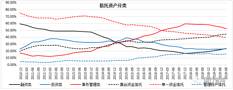 集合資金信托的占比呈逐步上升的特征,目前已升至45%以上。