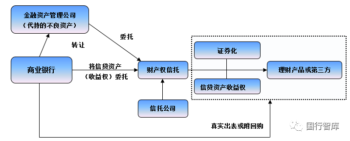 一是商業(yè)銀行將不良資產(chǎn)轉(zhuǎn)讓給AMC代持,而AMC將代持的不良資產(chǎn)委托給信托公司成立財(cái)產(chǎn)權(quán)信托,形成信托收益權(quán),并由商業(yè)銀行負(fù)責(zé)不良資產(chǎn)的處置清收工作(商業(yè)銀行承諾回購信托收益權(quán))。