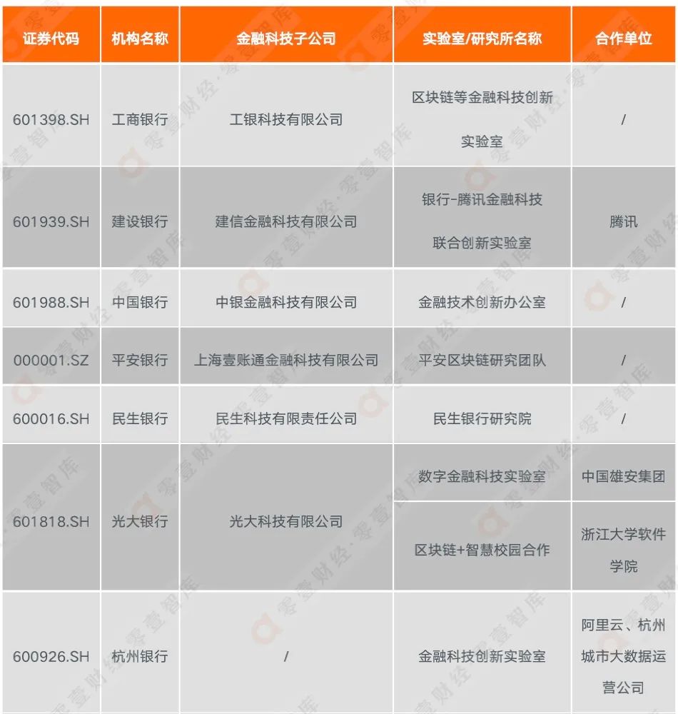 為了解上市公司區塊鏈業務的開展路徑,零壹智庫分別從211家區塊鏈相關上市公司中選取了銀行、證券公司及其他領域10家代表性上市公司,對其區塊鏈業務開展方式、落地領域等進行了分析。