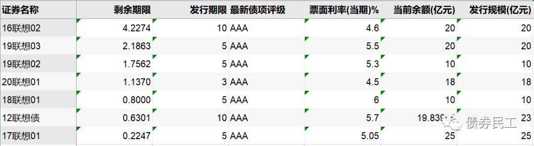 聯(lián)想控股的主體信用等級(jí)為AAA(聯(lián)合資信)。聯(lián)想控股存續(xù)債券為7只,存續(xù)債券金額為122.84億元,存續(xù)債券產(chǎn)品為小公募公司債券和企業(yè)債券,債券期限均為中長(zhǎng)期債券。