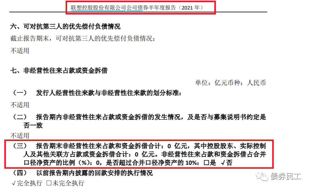 根據(jù)聯(lián)想控股2021年8月31日披露的公司債券半年度報(bào)告,截至2021年6月末,公司的非經(jīng)營(yíng)性往來(lái)款和資金拆借金額為0億元,也就是說(shuō)不存在非經(jīng)營(yíng)性往來(lái)款和資金拆借金。