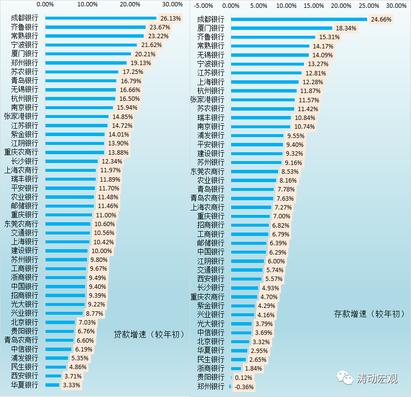 (三)存貸款增速:11家銀行貸款增速超15%、13家銀行存款增速超13%