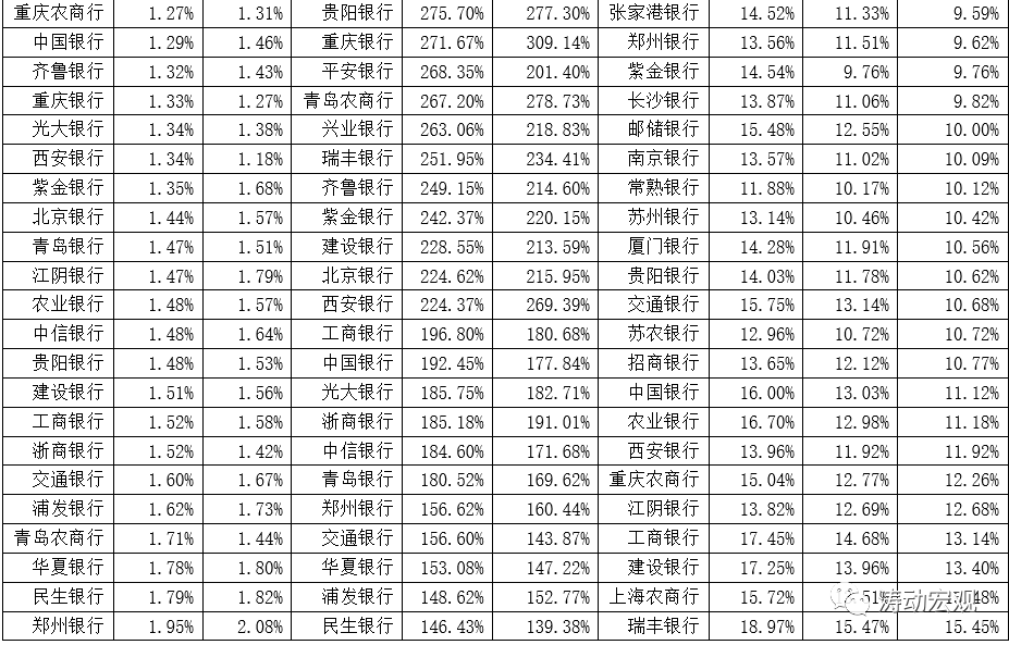 1、以不良貸款率來看,有10家銀行的不良貸款率低于1%,從低到高依次為寧波銀行(0.78%)、常熟銀行(0.81%)、郵儲銀行(0.82%)、杭州銀行(0.90%)、上海農(nóng)商行(0.90%)、南京銀行(0.91%)、廈門銀行(0.92%)、招商銀行(0.93%)、無錫銀行(0.93%)、張家港銀行(0.94%)。