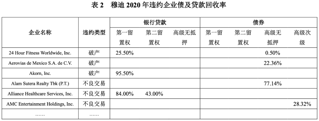 其次,穆迪年度違約和回收率報(bào)告的附件中,還會(huì)列示以交易價(jià)格衡量的當(dāng)年各違約企業(yè)債及貸款的回收率。以2020年度報(bào)告為例(詳見表2),本年違約企業(yè)24 Hour Fitness Worldwide, Inc的以交易價(jià)格衡量的高級(jí)無(wú)抵押債券的回收率為0.50%。