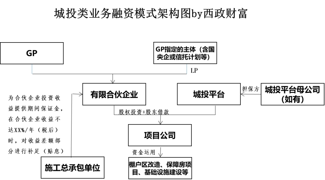 3. 增信擔(dān)保措施:施工總包單位對(duì)合伙企業(yè)期間收益提供期間保證金,并對(duì)合伙企業(yè)期間收益差額部分提供擔(dān)保(貼息),城投平臺(tái)的母公司提供擔(dān)保,項(xiàng)目公司章證照共管。