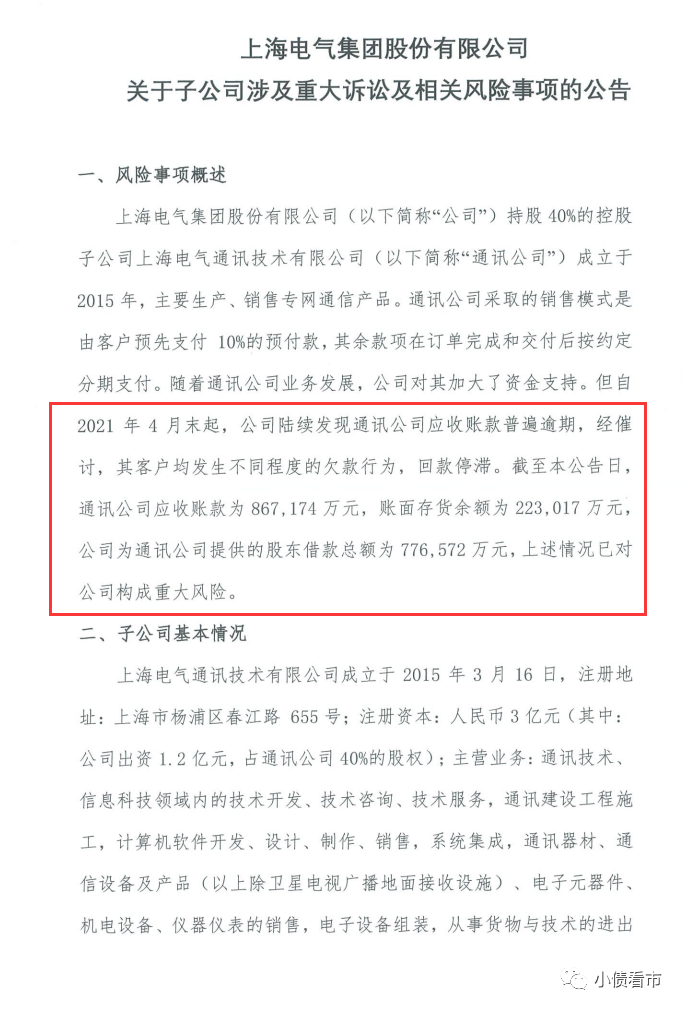 公告顯示,通訊公司應(yīng)收賬款余額為86.72億元,賬面存貨余額為22.3億元,上海電氣向通訊公司提供的股東借款金額合計(jì)為77.66億元,均存在重大損失風(fēng)險(xiǎn)。
