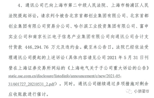 上海電氣稱,已針對(duì)拖欠子公司貨款的四家公司采取措施,包括向法院提起訴訟等。