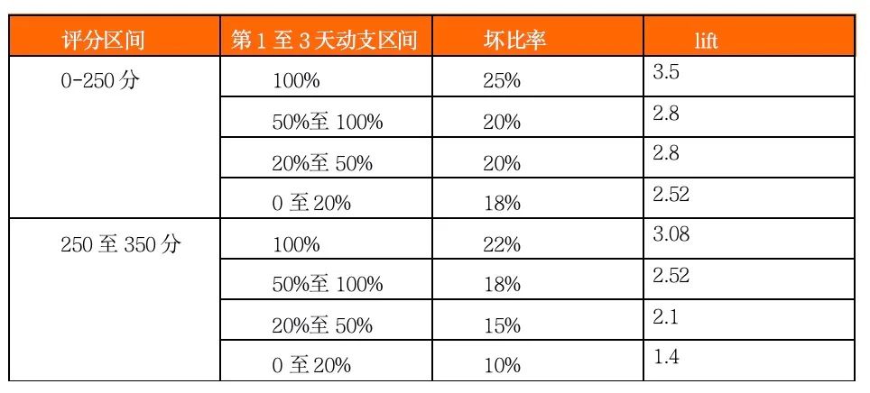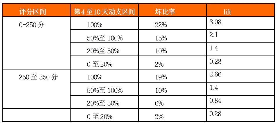 我們把未動支、未逾期客戶定義為好客戶,去除有逾期記錄灰客戶,通過轉移矩陣(滾動率)定義逾期N天以上為壞客戶。建立評分卡模型后,驗證好灰壞的排序性,同時針對建模和驗證客戶我們做動支分析。我們做貸中動支策略,首先是對動支評分、動支率、動支天數的觀察定策略。舉例:
