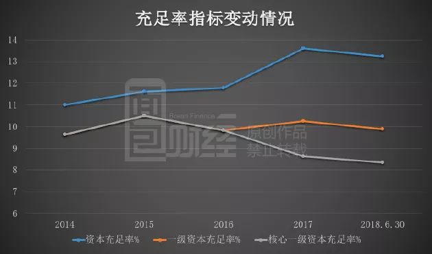 截止2018年6月30日,重慶銀行的核心一級資本充足率僅有8.34%,與2017年年末的8.62%相比,下降0.28個百分點。雖然滿足宏觀審慎體系下對非系統性重要銀行核心一級資本充足率7.5%的要求,但與2015年10.49%的核心一級資本充足率相比,目前處于較低水平,面臨一定的“補血”壓力。