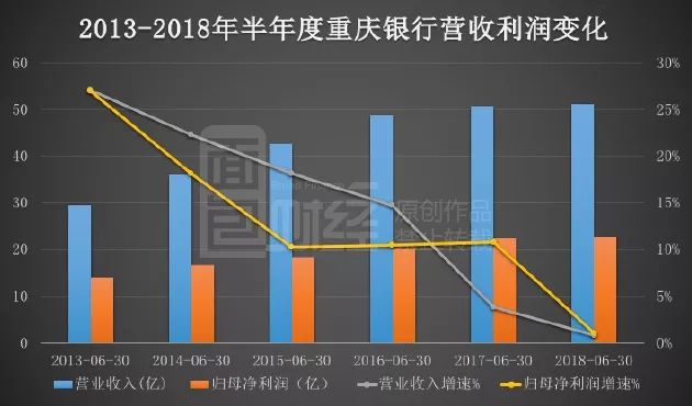 營收凈利潤實現翻倍增長的同時,增長速度卻在大幅下降。上市首年重慶銀行營收和凈利潤的增長速度速均為27%,次年增速便開始下滑。截止2018年6月30日,重慶銀行的營收增速僅有0.85%,歸母凈利潤的增速為1.02%,營收凈利在2018年上半年趨近于零增長。