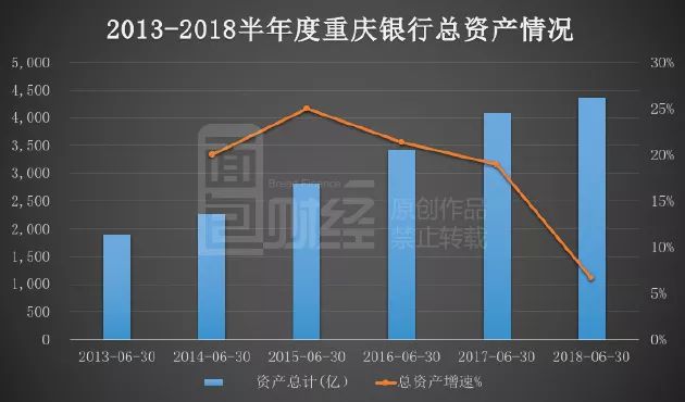 自2013年11月在港交所上市后,重慶銀行的總資產在近6年中不斷擴張,截止2018年6月30,重慶銀行的總資產為4358.19億元,較2017年同期相比增長6.71%。以下為根據公開數據整理的2013年至今重慶銀行總資產情況: