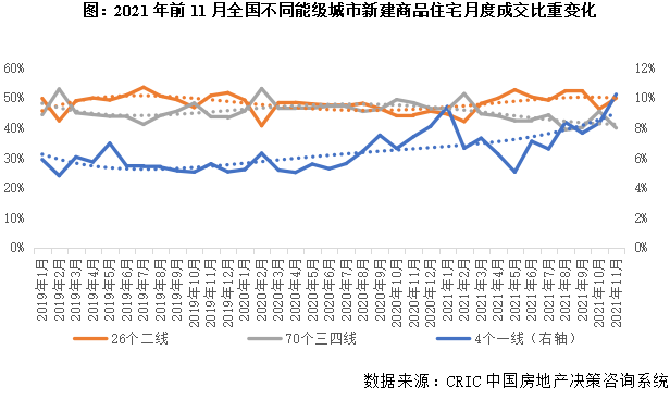 分能級來看,不同能級城市行情相對獨立,城市間分化也愈演愈烈:一線城市韌性較強,收入渠道的多樣使得居民購買力相對充裕,成交占比波動上行;二線城市則呈現出平穩態勢,占比基本在50%左右波動,城市內部分化加劇,漲多跌少,以廈門、杭州、南京、福州為典型的東南沿海城市,漲幅均在30%及以上;而諸如鄭州、昆明、南寧、西寧等中西部內陸城市,下行顯著;而廣大三四線城市回調加劇,跌多漲少,尤其是步入2021年下半年以來,市場一再探底,11月當月成交占比僅為40%,部分河南、山西、山東等中部三四線已然出現了首付分期、降價折扣等營銷手段齊上依舊難以拉動成交的情況,居民購買力透支已是不爭的事實,未來市場的成交表現難言樂觀。