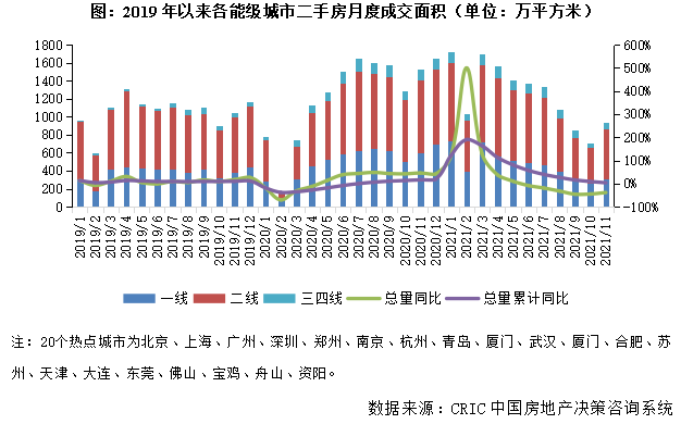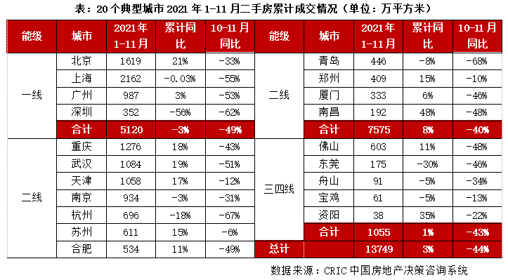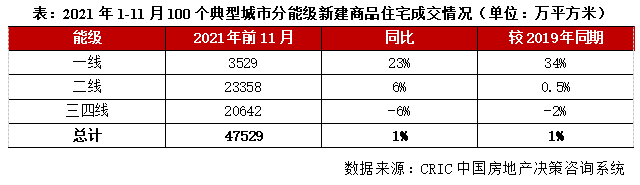 CRIC數據統計顯示,全國100個典型城市2021年前11月商品住宅成交面積合計47529萬平方米,同比增1%。