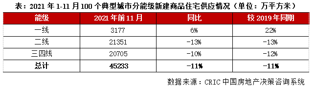 據CRIC統計,2021年前11月全國100個重點城市商品住宅新增供應面積45233萬平方米,相較2020年和2019年均同比下降11%。受新開工萎靡影響全年新房供應規模縮減至近三年低點。