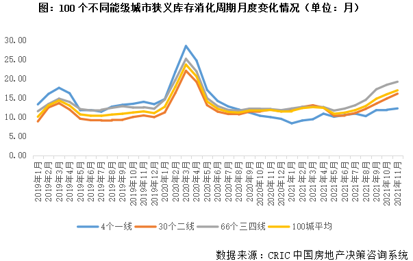 2021年因成交“先升后降”的行情,整體去化周期走勢也呈現出“先穩后增”態勢:1-7月基本持穩在10-12個月,8月隨著成交轉淡,去化周期開始逐月跳增,至11月末已達16.96個月。分能級來看,一線韌性較強,去化周期由去年年末的9.51個月上漲至12.23個月,顯著低于百城平均。二三線穩中有增,尤其是三四線城市,自5月開始去化周期步入陡增階段,由5月末的10.83個月波動上行至11月末的19.2個月。