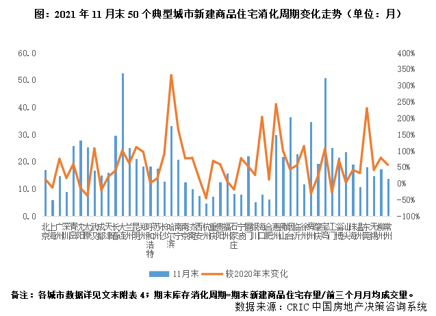 2020年整體的庫存變化延續了波動上行趨勢,1月跳增后,2-8月持穩,四季度以來伴隨供求轉淡,庫存量穩步上升,截至到11月末CRIC監測的100個重點城市庫存量達到了6.1億平方米,較2020年末上升了2%,不同城市漲跌參半,百城中有18個庫存消化周期高于24個月,大部分為缺乏基本面支撐的三四線城市,庫存風險浮出水面。