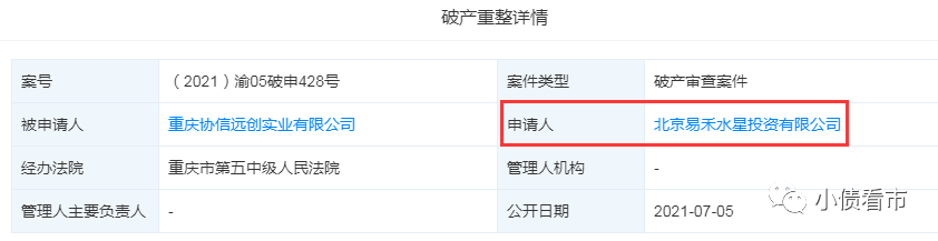 7月5日,重慶市第五中級人民法院發(fā)布案號為(2021)渝05破申428號的破產(chǎn)審查公告,重慶市協(xié)信遠創(chuàng)實業(yè)有限公司(以下簡稱“協(xié)信遠創(chuàng)”)被申請破產(chǎn)重整,申請人為北京易禾水星投資有限公司。