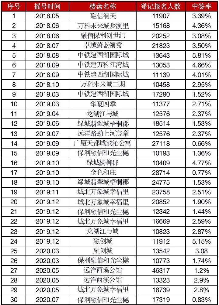 以曾6萬人搖的遠洋西溪公館為例,9月再推1213套房源,最終實際登記人數僅為4899戶,遠未達到“萬人搖”的標準,其綜合中簽率24.8%,相較于5月份最低1.2%的中簽率,足足增加了20倍。