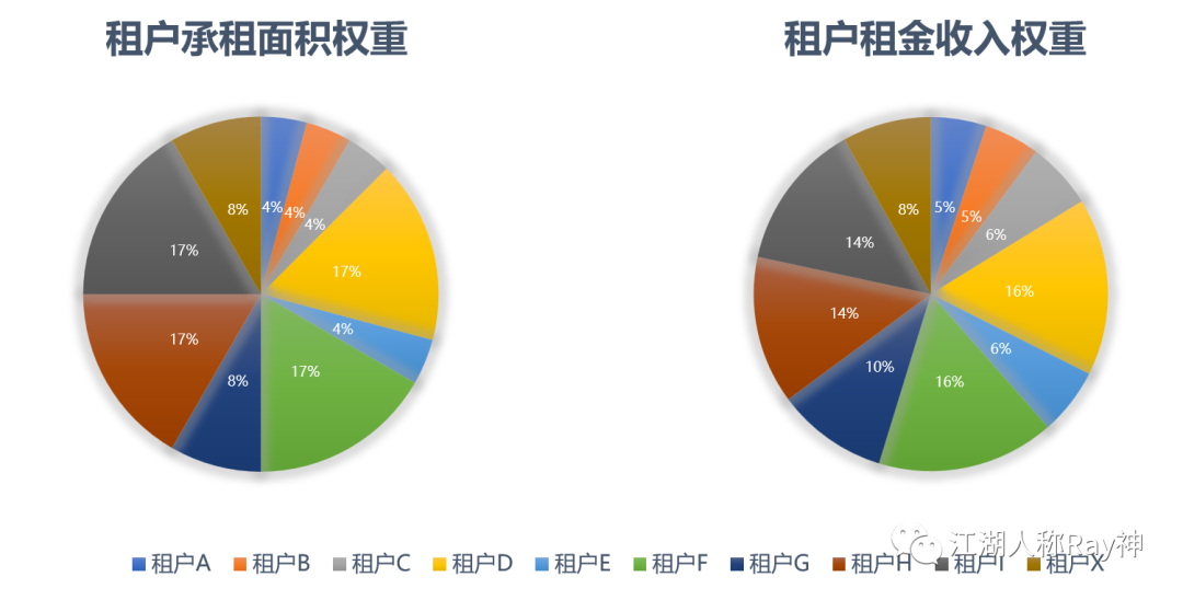 由于加權平均剩余租期衡量的是項目整體租賃收益的穩定性,因此它所使用的權重,就必須是可用于評價租戶對整體收益影響程度的指標。這方面的指標通常來說同樣也就是面積和租金收入了——基于面積,是因為不同租戶的承租面積不同,對樓宇未來的出租情況影響程度不同;基于租金收入,是因為租戶承租單價存在差異,承租面積不能完全代表租戶對樓宇租賃收益的影響程度,租金收入才是更完整的體現。