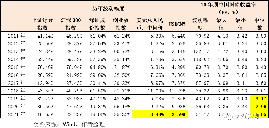 2021年,上證指數(shù)波動幅度僅有10.65%,創(chuàng)歷年最低:人民幣匯率波動幅度全年不到4%,亦創(chuàng)2015年以來最低。而諸多政策亦表明,2022年政策層面更關(guān)注金融市場的波動率,因此我們這里列舉了股市、匯市與債市2011年以來的歷年波動率情況,以供參考。例如,撇開2020年的特殊情形,近幾年10年期國債收益率中樞水平整體呈現(xiàn)下行態(tài)勢,而波動幅度則穩(wěn)定在40-100BP之間.