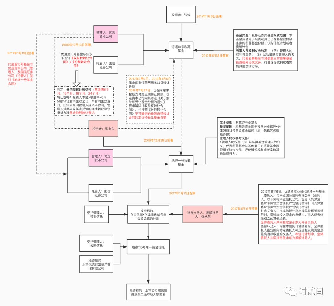 2017年1月16日,優(yōu)選資本公司代地坤一號基金(委托人)與興業(yè)國際信托有限公司(受托人)簽訂《興津浦鑫12號集合資金信托計劃信托合同》,約定投資于投資于云南信托公司設立的“睿贏115號單一資金信托,最終投向上市公司宏磊股份股票二級市場大宗交易。