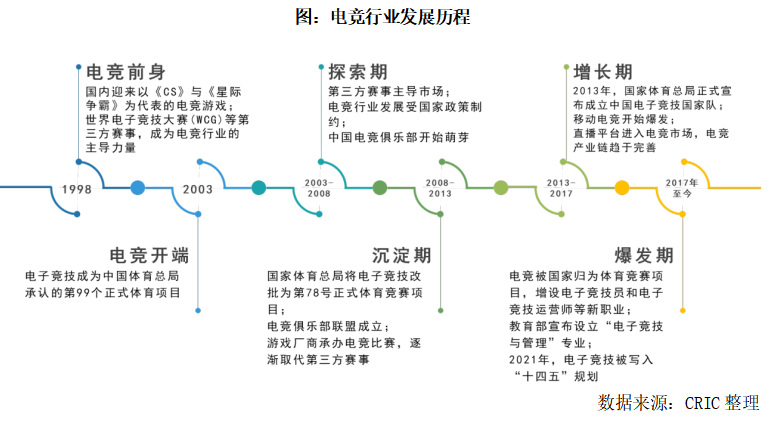 1998年,《CS》、《星際爭(zhēng)霸》等為代表的電競(jìng)游戲風(fēng)靡全國(guó),我國(guó)初露電競(jìng)萌芽。2003年,中國(guó)體育總局承認(rèn)電子競(jìng)技為我國(guó)正式開(kāi)展的第99個(gè)運(yùn)動(dòng)項(xiàng)目,標(biāo)志著國(guó)內(nèi)電競(jìng)的開(kāi)端。從2003年到2017年期間,電競(jìng)行業(yè)經(jīng)歷了探索期、沉淀期、增長(zhǎng)期,逐步從國(guó)家政策制約轉(zhuǎn)變?yōu)閲?guó)家支持,產(chǎn)業(yè)鏈趨于完善;2017年,電競(jìng)正式被國(guó)家歸為體育競(jìng)賽項(xiàng)目,并增設(shè)電競(jìng)相關(guān)專業(yè)與職業(yè);2021年,電競(jìng)?cè)雭啞ⅰ队⑿勐?lián)盟》總決賽奪冠,電子競(jìng)技產(chǎn)業(yè)的社會(huì)影響持續(xù)擴(kuò)大,電競(jìng)被寫(xiě)入“十四五”規(guī)劃,走向標(biāo)準(zhǔn)化,迎來(lái)快速增長(zhǎng)時(shí)期。