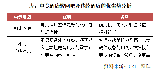 對(duì)于消費(fèi)者而言,電競(jìng)酒店與傳統(tǒng)網(wǎng)吧相比提供了更好的私密性和舒適性。而與傳統(tǒng)酒店相比,電競(jìng)酒店不僅能給外來(lái)旅客提供住宿和服務(wù),還能吸引當(dāng)?shù)氐碾姼?jìng)玩家在更好的環(huán)境里聚集,相對(duì)來(lái)說(shuō)客戶粘性更高。但電競(jìng)酒店從根本上來(lái)說(shuō)還是以酒店模式運(yùn)營(yíng),其重資產(chǎn)模式并未改變,電競(jìng)硬件設(shè)備的購(gòu)買、維護(hù)及管理需要投入更多的資金,不僅考驗(yàn)房企長(zhǎng)期的酒店管理及運(yùn)營(yíng)能力,也更考驗(yàn)電競(jìng)酒店的品牌打造和造勢(shì)宣傳。