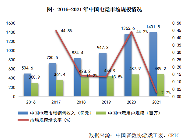 2016-2021年間,中國(guó)電競(jìng)行業(yè)迅速發(fā)展,市場(chǎng)規(guī)模平均復(fù)合增長(zhǎng)率達(dá)22.7%;截至2021年年末,中國(guó)電競(jìng)行業(yè)銷售規(guī)模達(dá)1401.8億元。其中,2020年因疫情居家隔離政策,增加了電競(jìng)游戲時(shí)間,電競(jìng)用戶同比增長(zhǎng)9.6%至約4.88億人,市場(chǎng)銷售收入同比增長(zhǎng)44.2%;2021年受疫情持續(xù)反復(fù)影響,電競(jìng)重要線下賽事減少,線上模式商業(yè)變現(xiàn)受阻,同時(shí)受制于未成年人網(wǎng)絡(luò)游戲防沉迷等相關(guān)政策要求,中國(guó)電競(jìng)規(guī)模增速放緩,銷售收入同比增長(zhǎng)率僅2.7%。