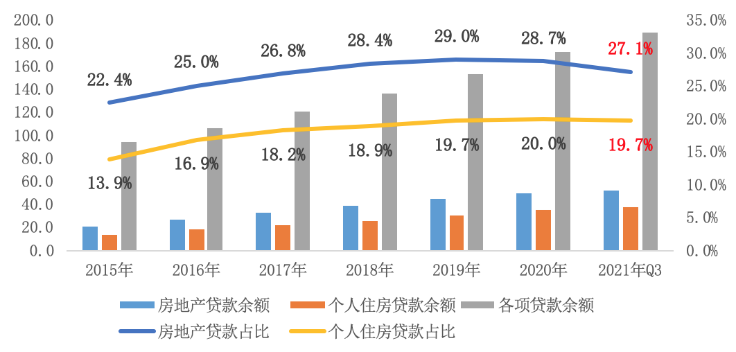 2021年三季度末,全國房地產(chǎn)貸款余額51.4萬億元,占各項(xiàng)貸款余額的比重進(jìn)一步回落至27.1%,較2020年末再降1.6個(gè)百分點(diǎn)。其中,個(gè)人住房貸款余額37.4萬億元,占各項(xiàng)貸款余額的比重跌至19.7%,較2020年末減少0.3個(gè)百分點(diǎn)。