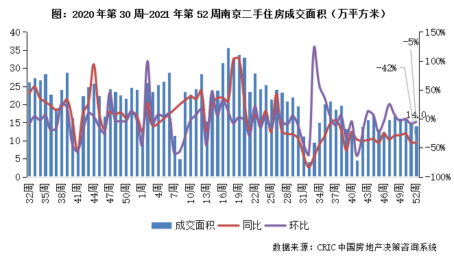 2021年第52周,南京二手住房成交面積收14.0萬平方米,環比較上周回落5%,同比跌幅擴大至42%。本周成交規模持續小幅回落但仍有支撐,四季度以來市場規模震蕩盤整,短期內市場或持續震蕩。