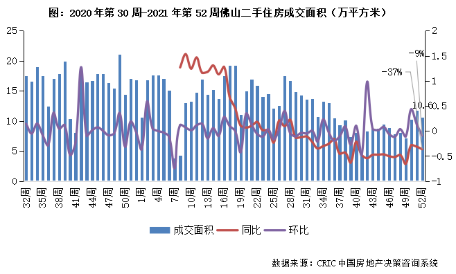 2021年第52周,佛山二手住房成交面積環比下降9%、同比降幅增至37%,成交體量收10.6萬平方米。四季度以來市場平穩運行,年末市場有所放量,本周成交正常回調,短期內或保持企穩增長。
