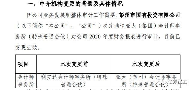 3、彭州市國有投資有限公司2021年4月30日公告,決定聘請亞太(集團)會計師事 務(wù)所(特殊普通合伙)對公司 2020 年度財務(wù)報表進行審計。