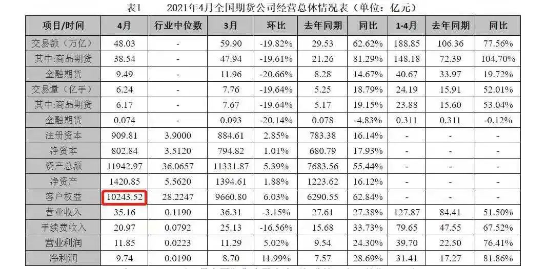 根據(jù)中國期貨業(yè)協(xié)會最新發(fā)布的數(shù)據(jù)顯示,截止到4月底,期貨市場客戶權(quán)益金額已達(dá)到了10,243.52億元,這是期貨歷史上首次突破萬億元大關(guān)。