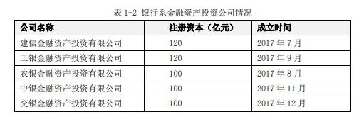2016年10月國(guó)務(wù)院《關(guān)于市場(chǎng)化銀行債權(quán)轉(zhuǎn)股權(quán)的指導(dǎo)意見》,明確了銀行通過向?qū)嵤C(jī)構(gòu)轉(zhuǎn)讓債權(quán)、由實(shí)施機(jī)構(gòu)將債權(quán)轉(zhuǎn)為對(duì)象企業(yè)股權(quán)的方式實(shí)現(xiàn)市場(chǎng)化債轉(zhuǎn)股。2017年7月20日銀監(jiān)會(huì)批準(zhǔn)建信金融資產(chǎn)投資有限公司開業(yè),隨后農(nóng)銀、工銀、中銀、交銀相繼獲批開業(yè),五大行的AIC成立(見表1-2),主業(yè)為市場(chǎng)化債轉(zhuǎn)股。