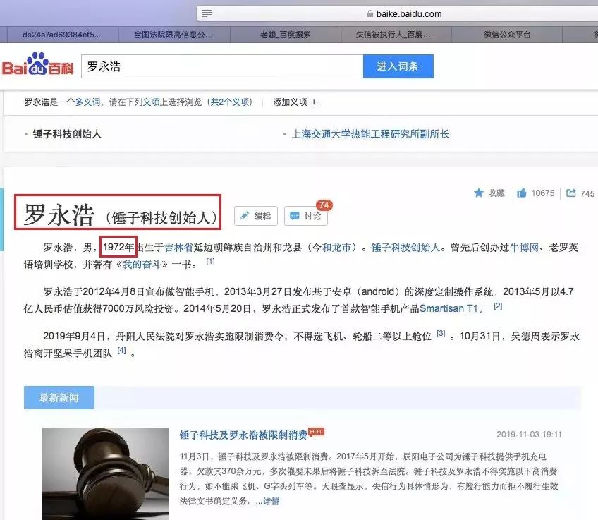 從被執行人名單里,可以查詢到有3條名為羅永浩的被執行人查詢結果,這三條信息實為同一人,出生年份為1977年,并非錘子科技的羅永浩CEO(1972年生,百度百科)。